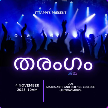 Tarangam, the Talents Day of the ITEP students, was organised on ___ in the AV Hall of Majlis Arts and Science College. The programme aimed to provide an encouraging platform for first-year students to showcase their talents and strengthen the sense of belonging within the new batch.